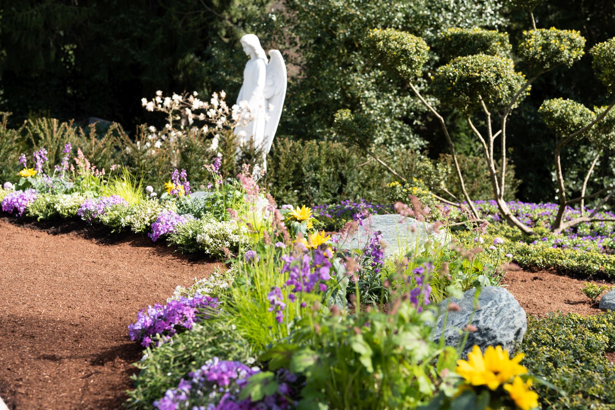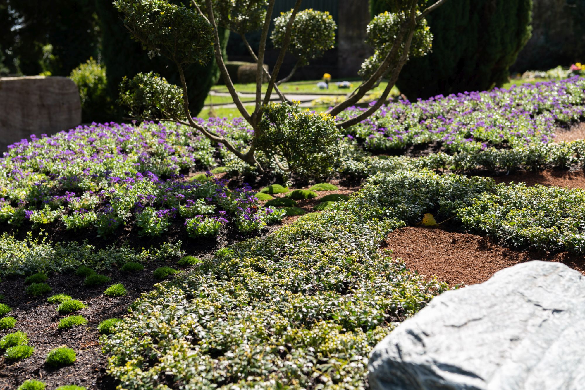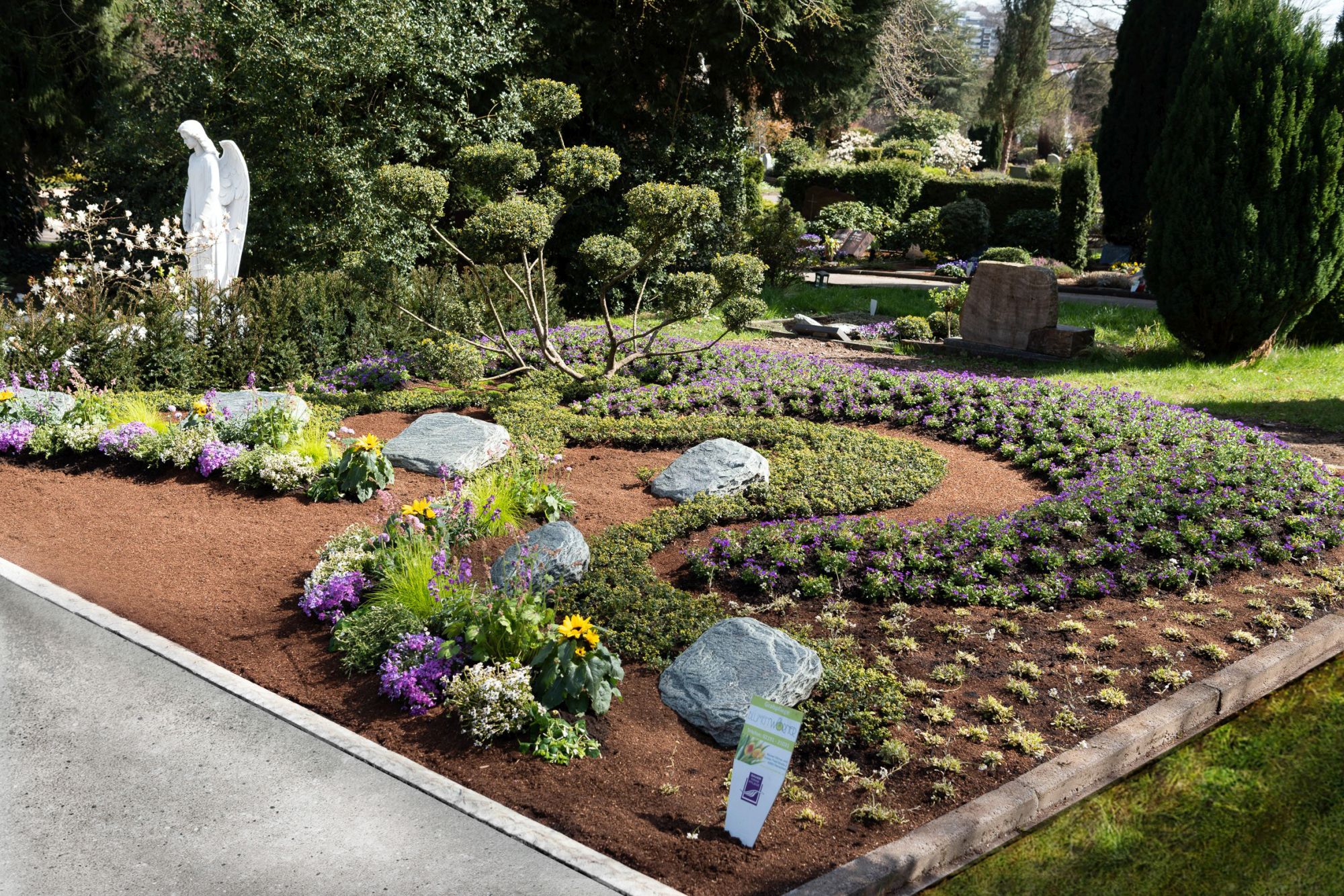 Wunderschön in die Friedhofslandschaft eingebettet, direkt am Hauptweg, ist dieses einzigartige Grabfeld entstanden. Ein blühendes und anspruchsvolles Grabfeld mit Stauden, immergrünen Bodendeckern und im Jahresverlauf wechselnde prachtvolle Blühflächen wurde geschaffen.