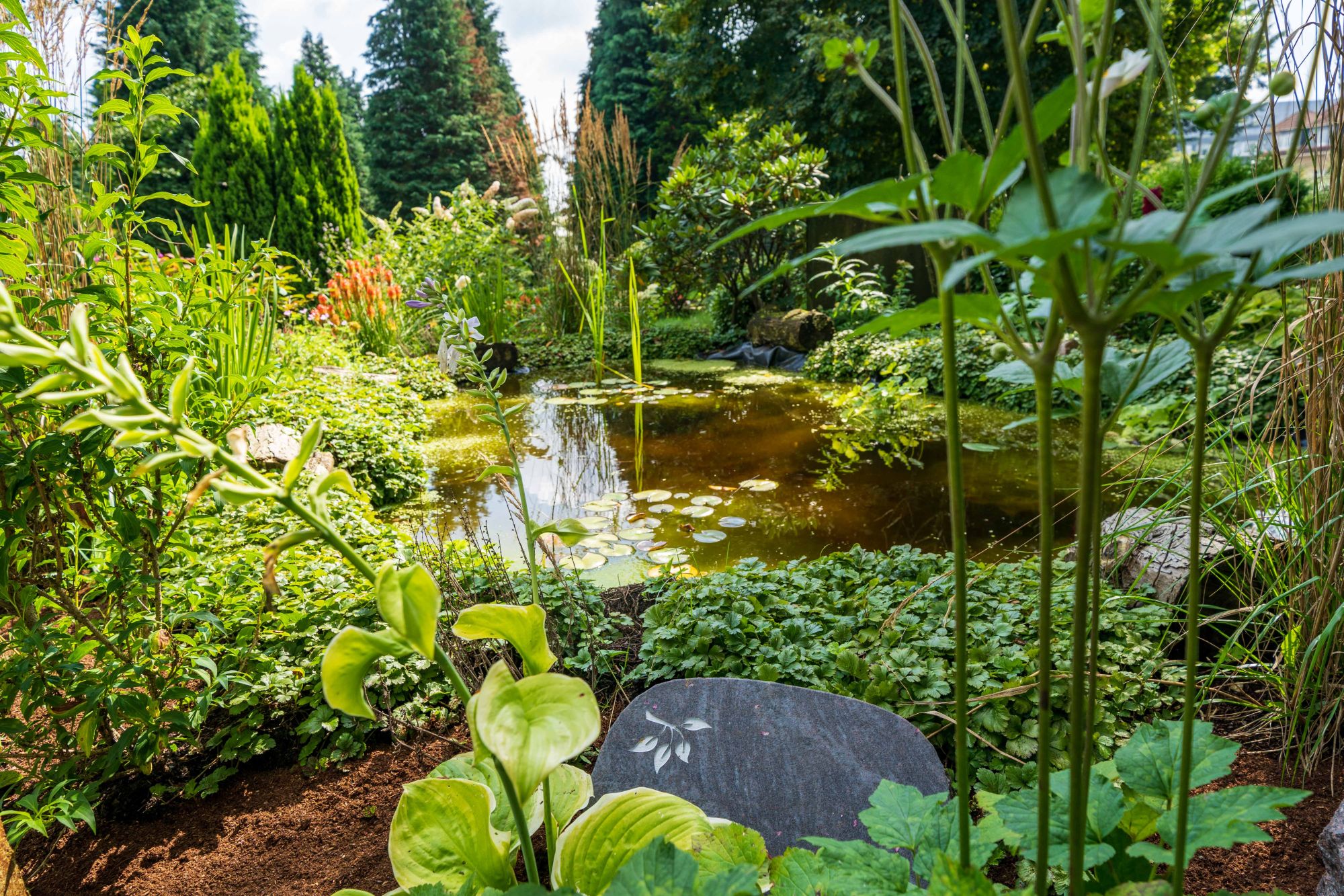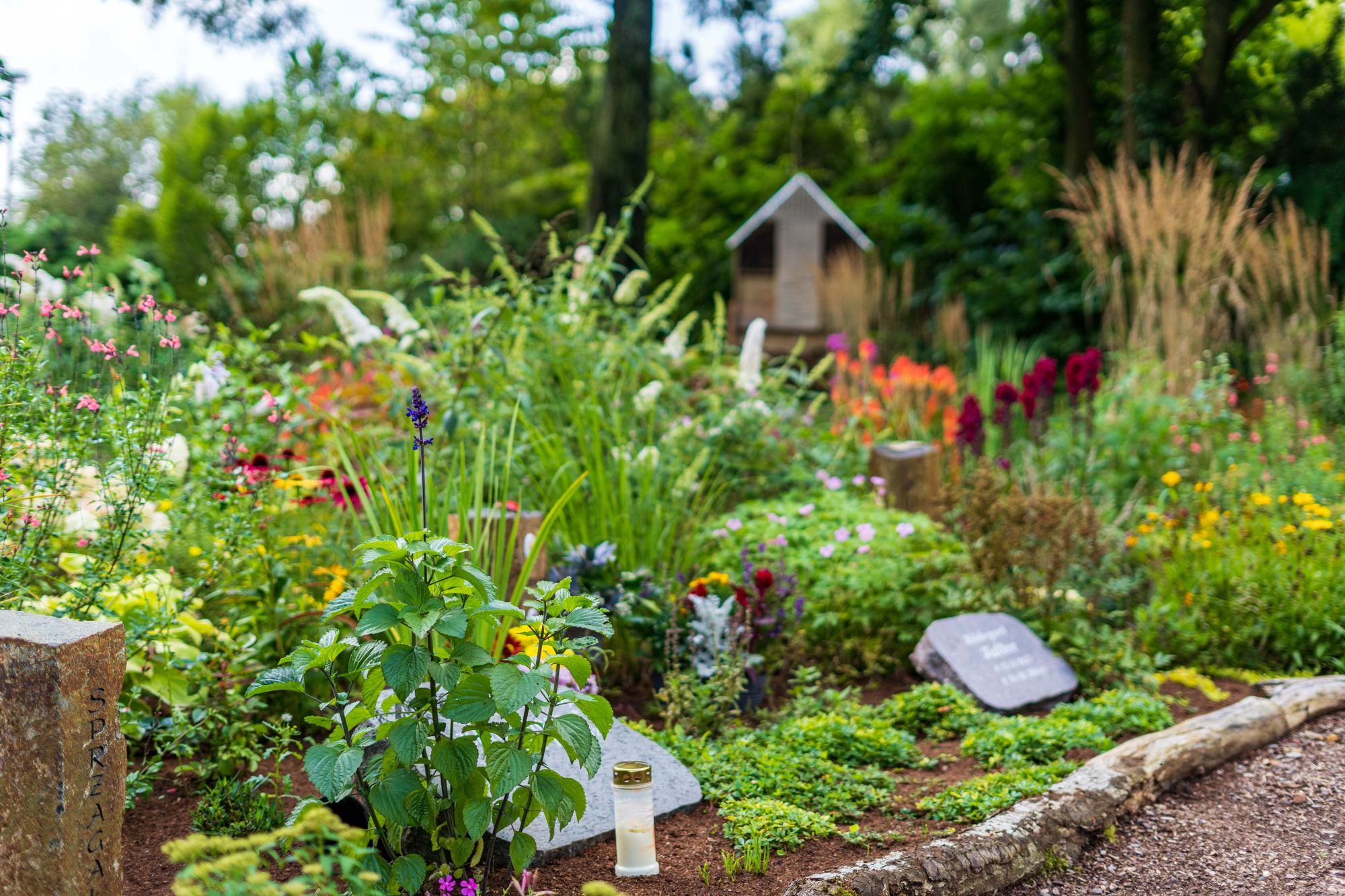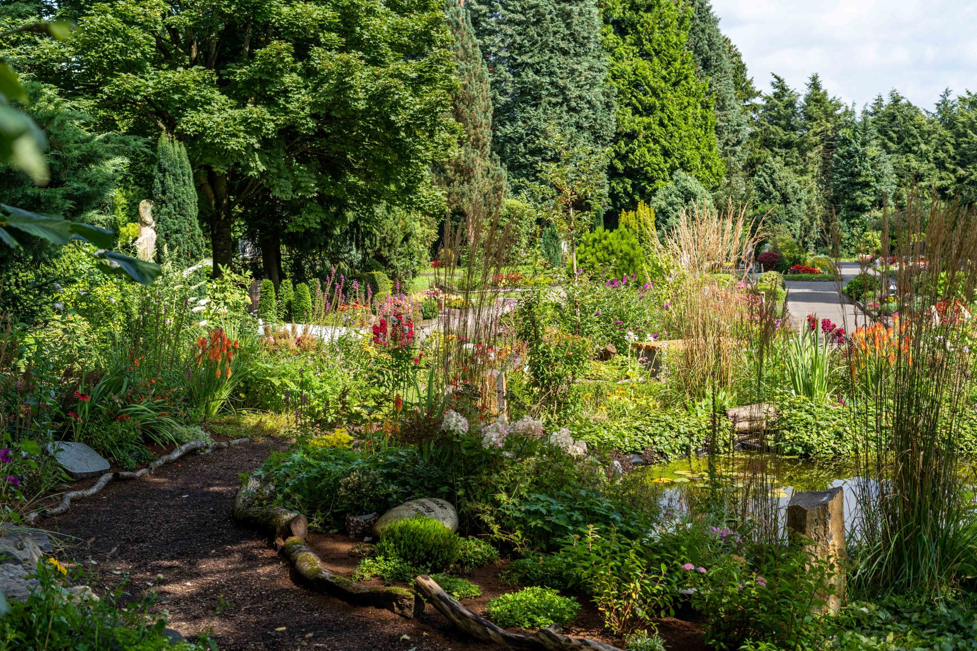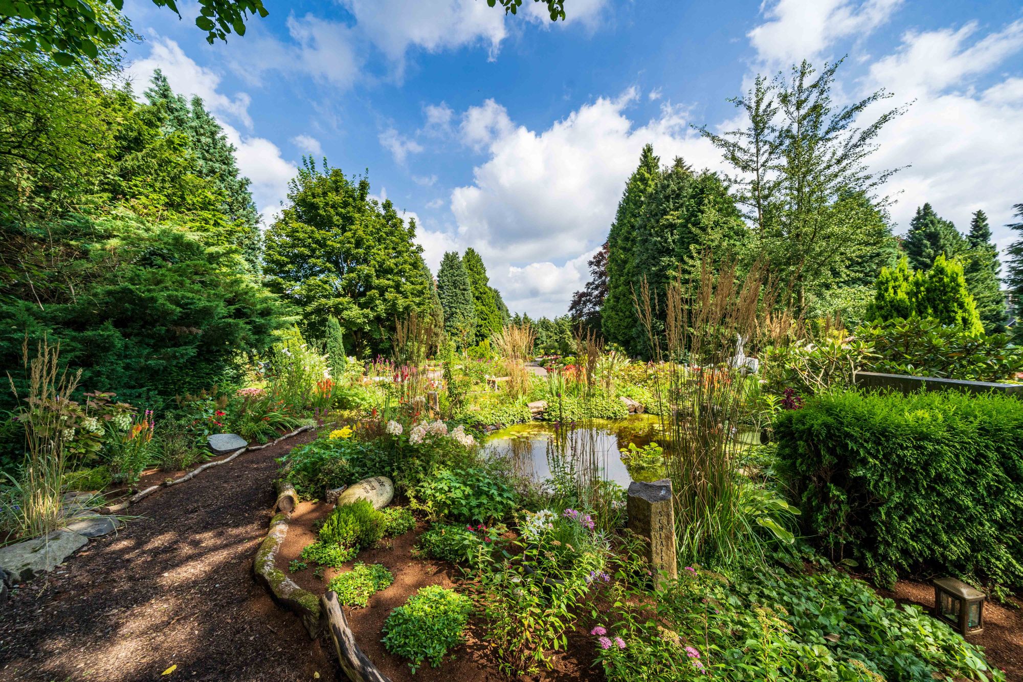 Und noch mehr Naturbestattung ist auf unserem Remscheider Stadtfriedhof möglich: Innerhalb des Memoriam-Gartens haben wir auf ca. 300 qm mit „NaturRuh“ ein ökologisches und wunderschön gestaltetes Grabfeld geschaffen – ganz nach den Richtlinien von NaturRuh. Ewige Ruhe inmitten einer lebendigen Wildblumenwiese mit einer kleinen Teichanlage, insektenfreundlicher und farbenfroher Staudenbepflanzung samt Insektenhotel und Bienenstöcken. Durch die jahreszeitliche Blütenabfolge entfällt eine saisonale Wechselbepflanzung wie bei klassischen Grabanlagen üblich.